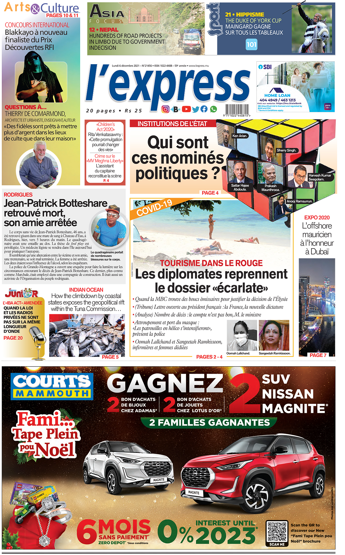 En une de l'express de ce lundi: Covid-19 - Tourisme dans le rouge : Les diplomates reprennent le dossier «écarlate»; Autre titre: Institutions de l’état : Qui sont ces nominés politiques ?