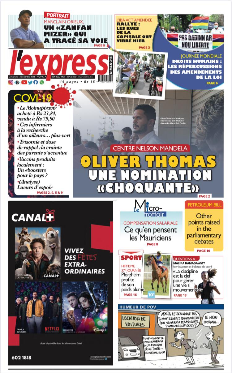 En une de l'express: Centre Nelson Mandela: Oliver Thomas une nomination «choquante»; Autre titre: Covid-19: Le Molnupiravir acheté à Rs 23,84, vendu à Rs 79,90.