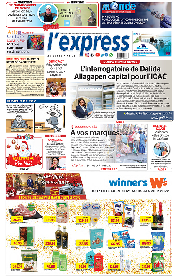 En une de l'express: Scandale Molnupiravir: l’interrogatoire de Dalida Allagapen capital pour l’ICAC ; Autre titre: Fêtes de fin d’année: à vos marques…
