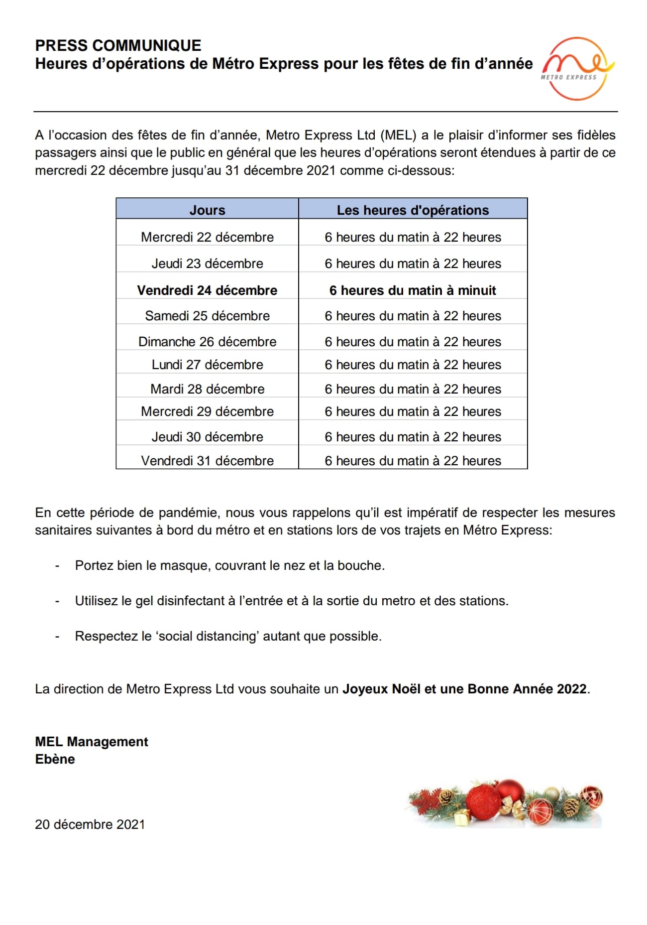 Le communiqué a été émis en ce lundi 20 décembre. MEL annonce de nouveaux horaires pour le métro en cette période de fêtes. Les trams seront ainsi disponibles de 6 à 22 heures dès mercredi et même jusqu à minuit le 24 décembre.
