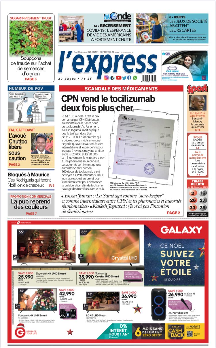En une de l'express: Scandale des médicaments: CPN vend le tocilizumab deux fois plus cher ; Autre titre: Faux affidavit: L’avoué Chuttoo libéré sous caution.