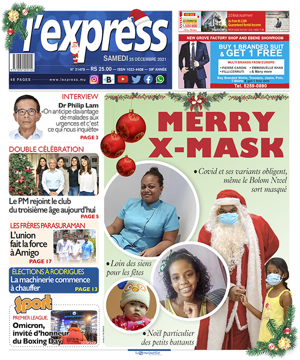 En une de l'express: Merry X-Mask ; Autre titre: Double célébration: Pravind Jugnauth a 60 ans aujourd’hui