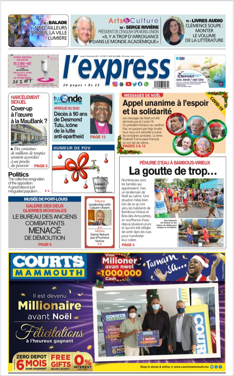 En une de l'express: Messages de Noël: Appel unanime à l’espoir et la solidarité; Autre titre: Pénurie d’eau à Bambous-Virieux: La goutte de trop…