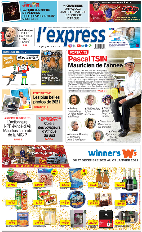 En une de l'express: Pascal Tsin: Mauricien de l’année ; Autre titre: Compagnies d’état: pourquoi la MIC a racheté les actions du NPF d’Air Mauritius ?