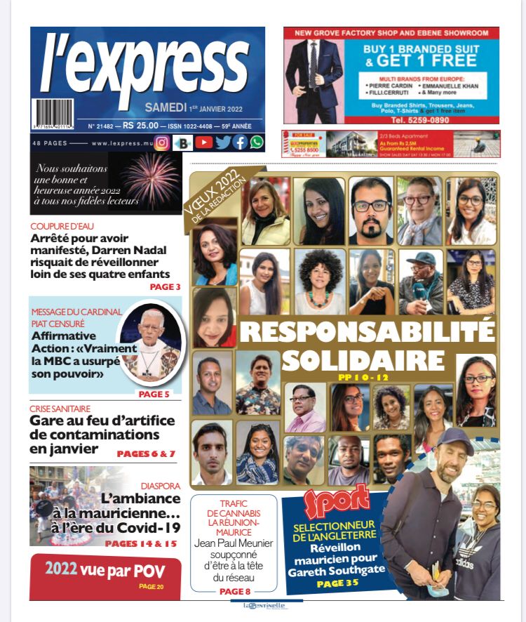 En une de l'express de ce samedi: Vœux 2022 de la rédaction: responsabilité solidaire; Autre titre: Coupure d’eau: Arrêté pour avoir manifesté, Darren Nadal risquait de réveillonner loin de ses quatre enfants.
