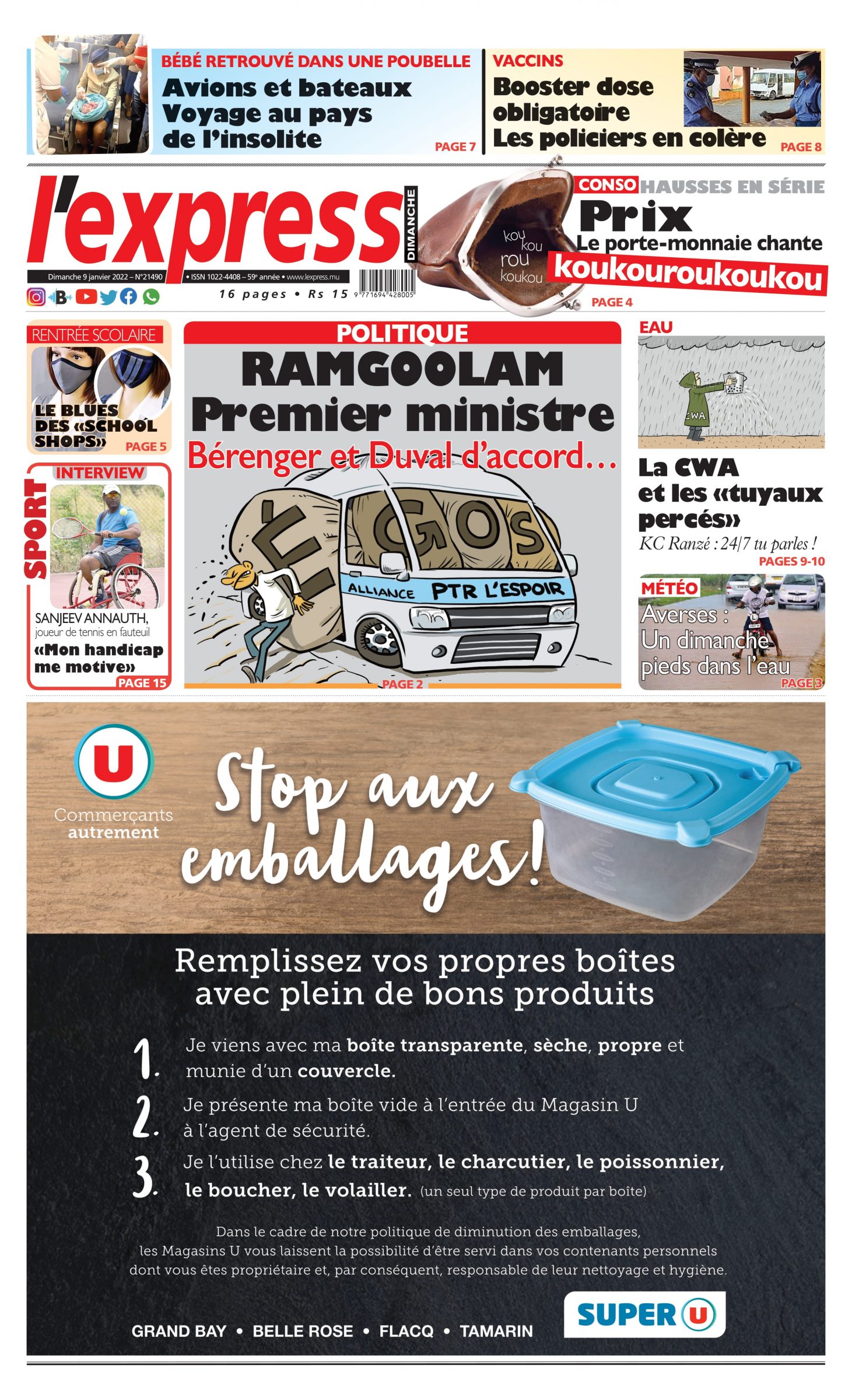 En une de l'express : Ramgoolam Premier ministre Bérenger et Duval d’accord…Autre titre: Le blues des «school shops»