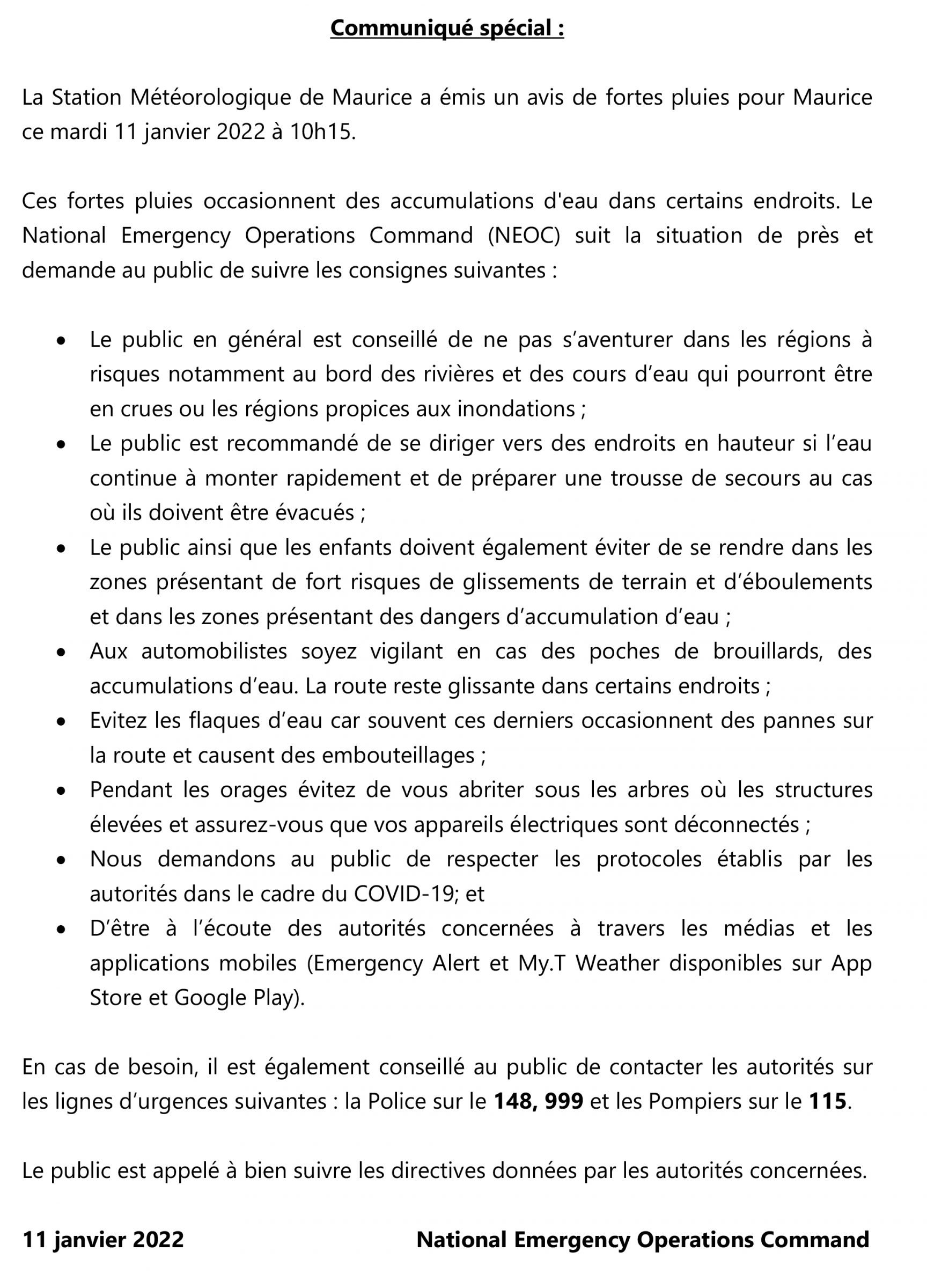 La station météo de Vacoas a émis un avis de fortes pluies, ce mardi 11 janvier. Cet avertissement est valable jusqu'à 16 h 00 cet après-midi.