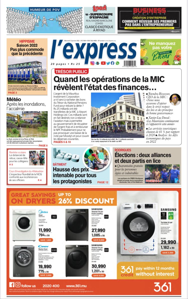 En une de l'express: Trésor Public: Quand les opérations de la MIC révèlent l’état des finances…; Autre titre: Rodrigues - Élections : deux alliances et deux partis en lice.
