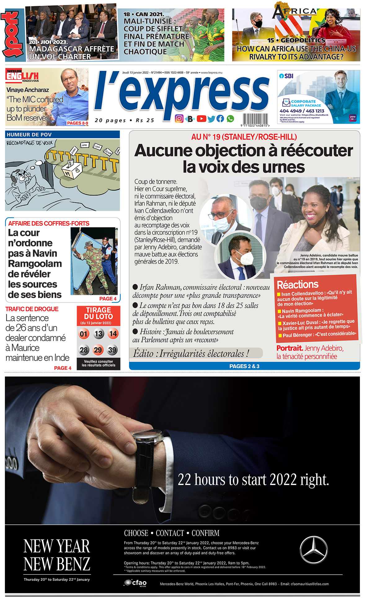 En une de l'express: Au n° 19 (Stanley/Rose-Hill) : Aucune objection à réécouter la voix des urnes; Autre titre: Affaire des coffres-forts : La cour n’ordonne pas à Navin Ramgoolam de révéler les sources de ses biens.