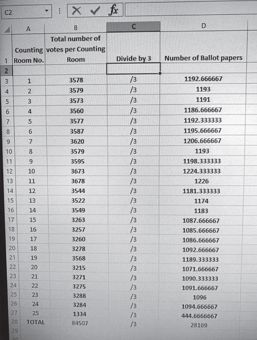 Il y a d’abord l’arithmétique du «multiple de 3». Un bulletin n’est valide que si trois votes sont exprimés. Ainsi, si on totalise tous les votes «valides et comptabilisés» d’une salle de classe, le chiffre doit être divisible par 3. Or dans 18 des 25 counting rooms, le total des votes comptabilisés ne l’est pas. Ce qui fait qu’il y a forcément une ou plusieurs erreurs.