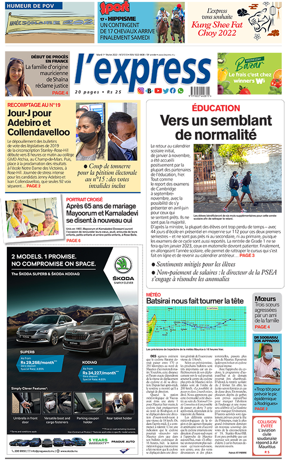 En une de l'express: Éducation: vers un semblant de normalité ; Autre titre: Recomptage au n°19: jour-J pour Adebiro et Collendavelloo