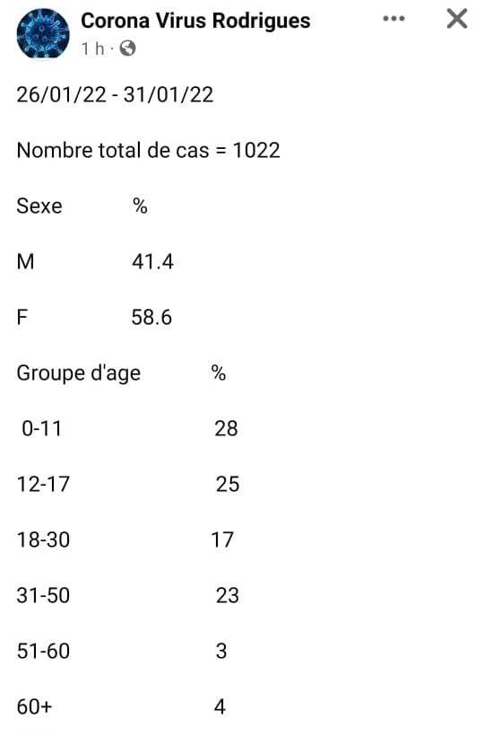 Selon le dernier décompte publié par la page officielle du Covid-19 à Rodrigues ce mardi 1er février, l'île compte 1022 cas. En terme de pourcentage, les enfants qui sont les plus touchés. 28% de patients positifs sont âgés de 0 à 11 ans ont été testés positifs. Quant aux ados de 12 à 17 ans, ils comptent pour 25% des patients.