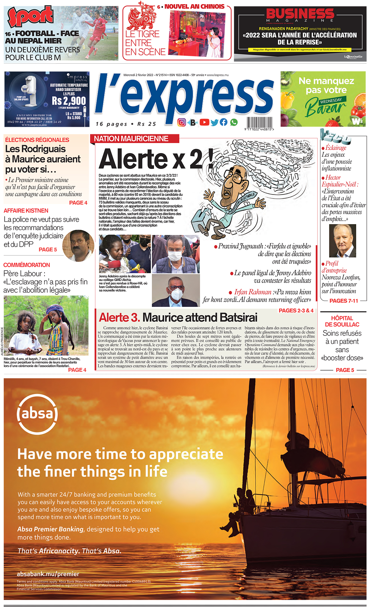 En une de l'express: Nation Mauricienne : Alerte x 2 ! Autre titre: Élections régionales : Les Rodriguais à Maurice auraient pu voter si….