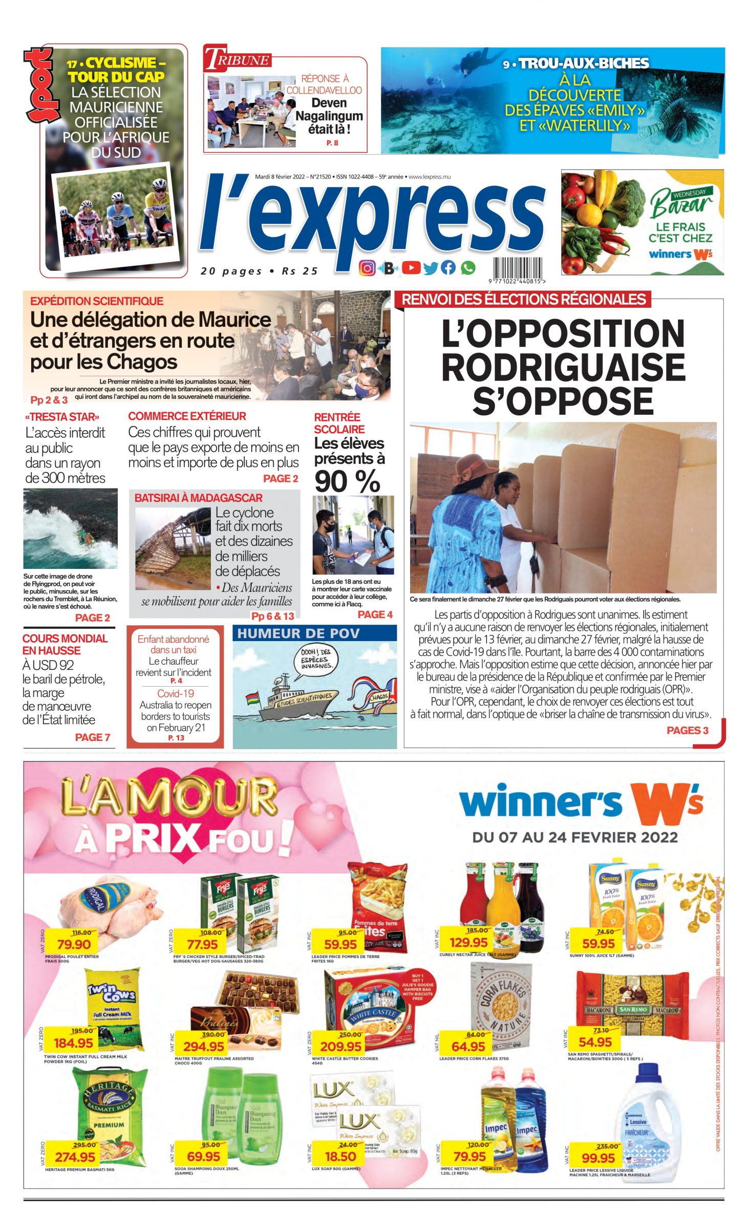 En une de l'express; Renvoi des élections régionales: l’opposition rodriguaise s’oppose; Autre titre; Commerce extérieur: Ces chiffres qui prouvent que le pays exporte de moins en moins et importe de plus en plus.