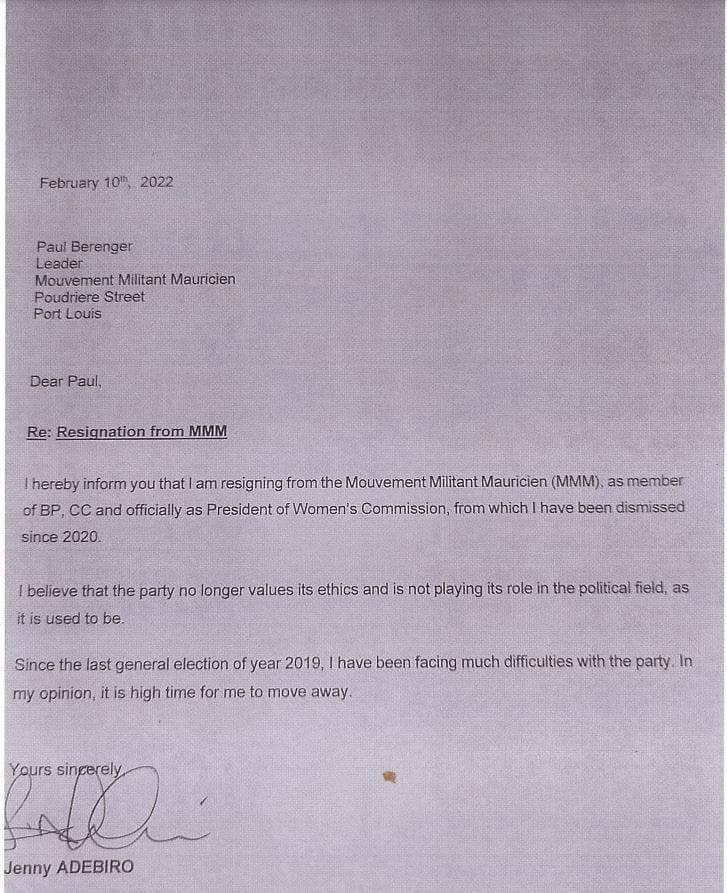 La colistière de Paul Berenger au no 19 Stanley-Rose-Hill a soumis sa démission ce jeudi 10 février du bureau politique, du comité central et officiellement comme présidente de la commission des femmes du Mouvement militant mauricien (MMM).