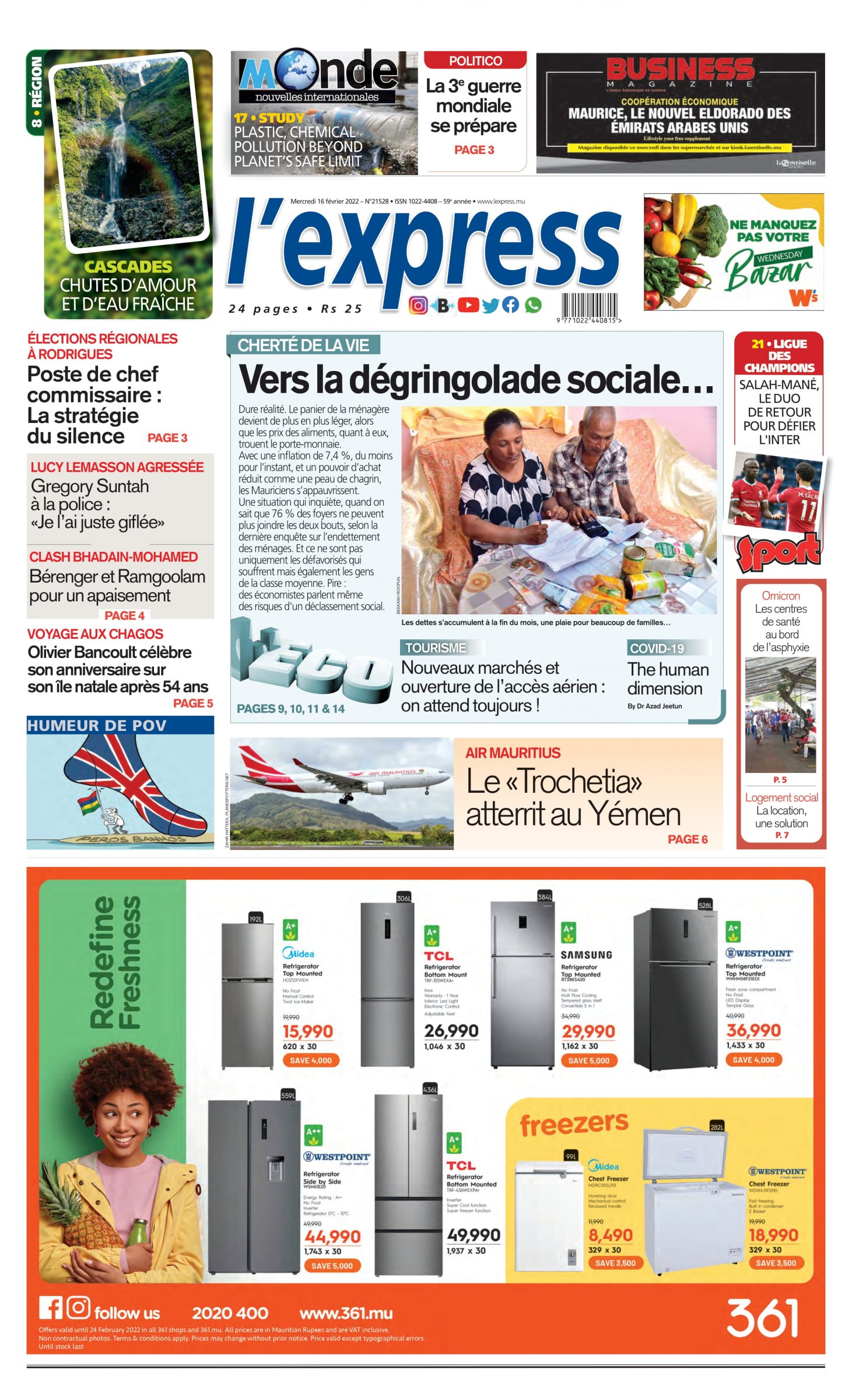 En Une de l'express; Cherté de la vie: Vers la dégringolade sociale… Autre titre; Olivier Bancoult célèbre son anniversaire sur son île natale après 54 ans.