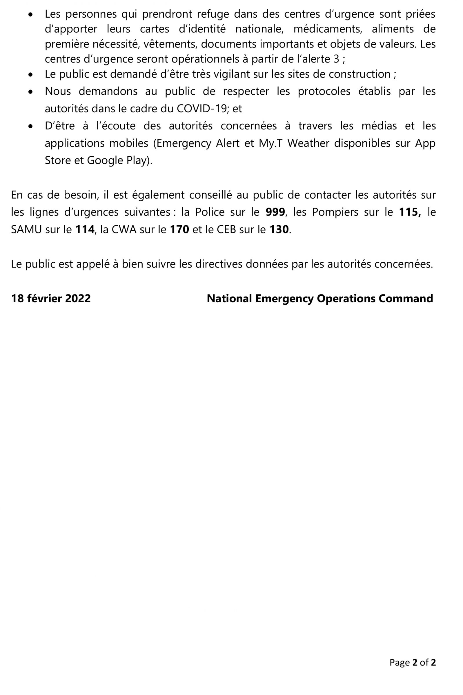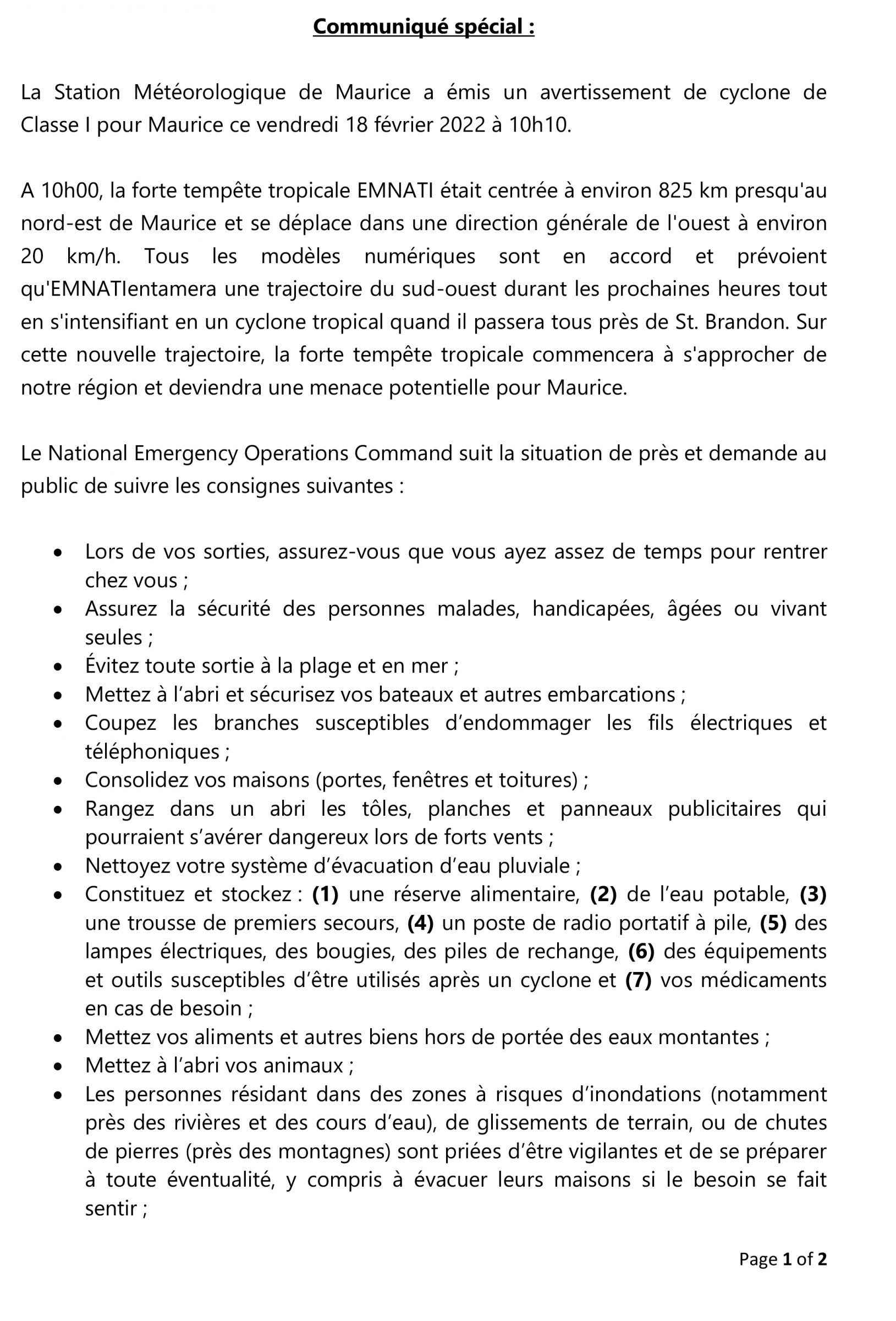 Premier bulletin de cyclone pour Maurice émis à 1010 heures ce vendredi 18 février 2022. Les dernières observations satellitaire confirme qu'Emnati continue à s'intensifier. La pression au centre du système est estimée à environ 976 hPa et les rafales près du centre sont de 140 km/h.