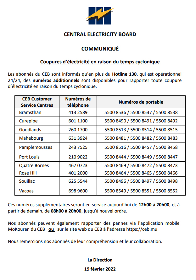Ce samedi 19 février, le CEB a émis un communiqué pour informer ses abonnés qu’en cas de coupure due au cyclone Emnati, ils peuvent appeler sur les numéros suivants pour rapporter la panne. Ces numéros seront disponibles jusqu’à 20 heures ce soir et de 8 heures à 20 heures demain, dimanche 20 février.