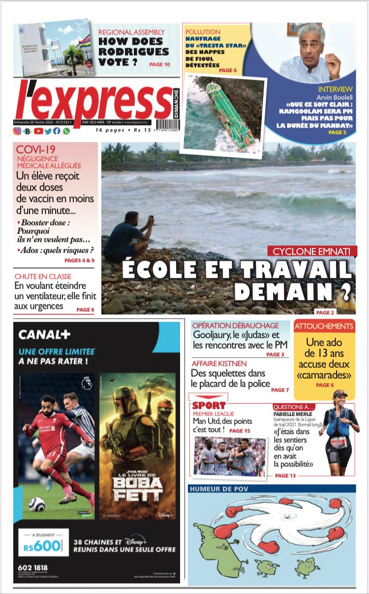 En une de l'express: Cyclone Emnati: École et travail demain ?; Autre titre: Covid-19 – Négligence médicale alléguée: Un élève reçoit deux doses de vaccin en moins d’une minute...