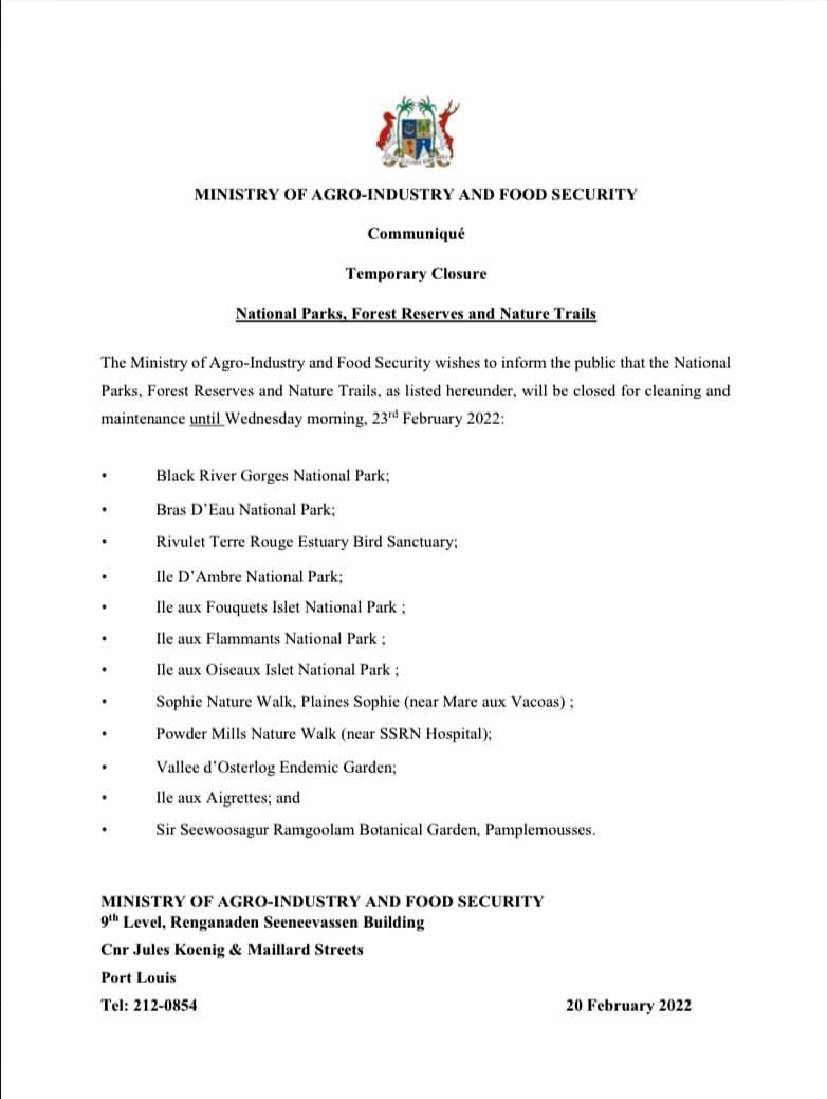 Dans un communiqué émis ce dimanche 20 février, le ministère de l’Agro-Industrie a fait savoir que les parcs, trails et réserves naturelles seront fermés jusqu’au mercredi 23 février pour cause de nettoyage. Ci-dessous la liste des lieux concernés: