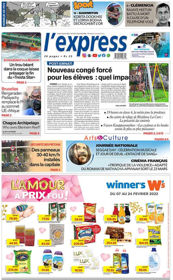 En une de l'express: Nouveau congé forcé pour les élèves: quel impact ? Autre titre: Sécurité des piétons: les panneaux 30-40 km/h installés à Port-Louis