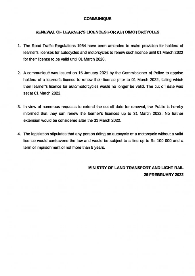 Les files d’attente s’étirent à perte de vue depuis quelques jours, devant les Casernes centrales, à Port-Louis.  Des motocyclistes s’y rendent en fait, pour renouveler leur learner. Face à la situation chaotique, les autorités ont décidé d’étendre le délai, qui expirait le 1er mars, au 31 mars 2022. Un communiqué a été émis en ce sens en ce vendredi 25 février.