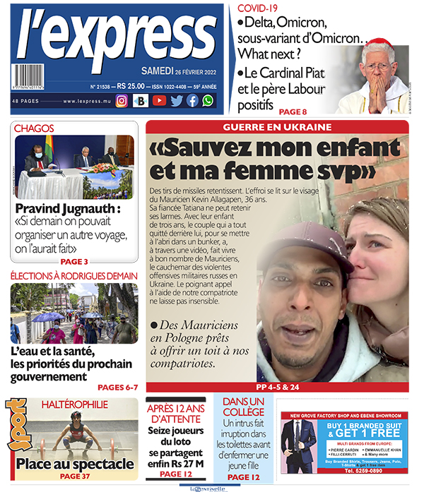 En une de l'express: Guerre en Ukraine: «Sauvez mon enfant et ma femme svp» ; Autre titre: Pravind Jugnauth: «Si demain on pouvait organiser un autre voyage, on l’aurait fait»