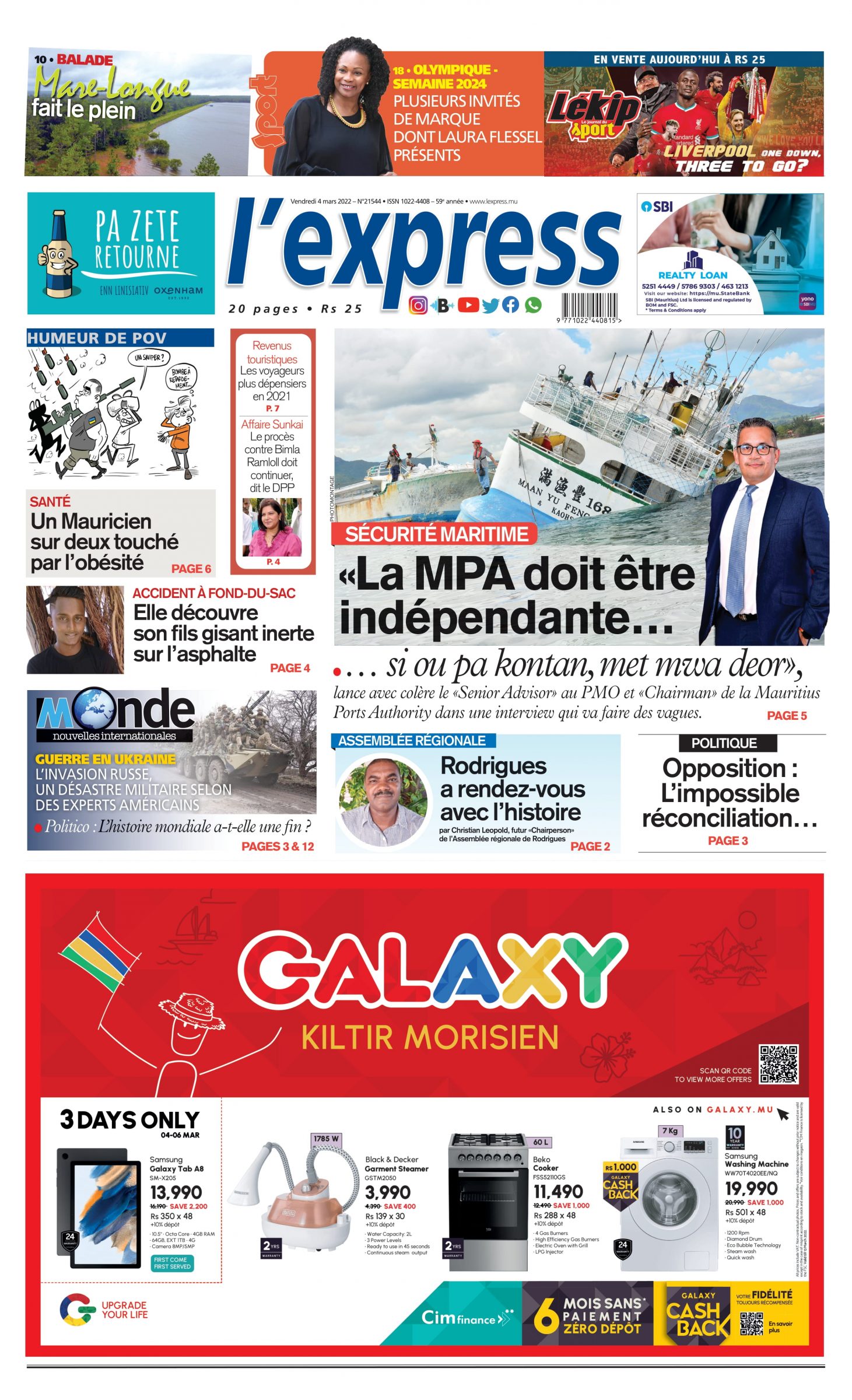 En une de l'express: Sécurité maritime «La MPA doit être indépendante…Autre titre; Un Mauricien sur deux touché par l’obésité.