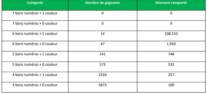 14 gagnants remportent le jackpot avec seulement 6 numéros + 1 couleur et empochent Rs 108,153 chacun.