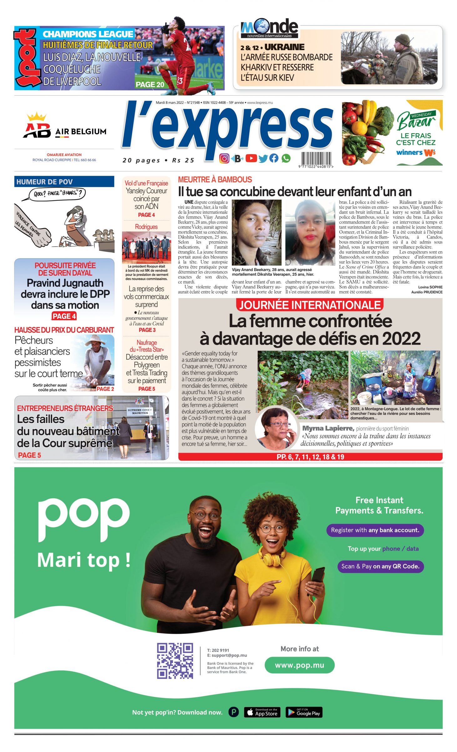 En une de l'express; Meurtre à Bambous: il tue sa concubine devant leur enfant d’un an; Autre titre; La femme confrontée à davantage de défis en 2022