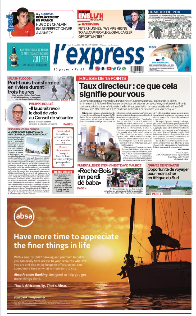 En une de l'express: Hausse de 15 points - Taux directeur : ce que cela signifie pour vous; Autre titre: Funérailles de Stéphanie et David Maurice: «Roche-Bois inn perdi dé baba»