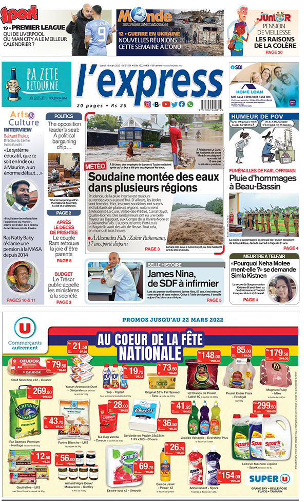 En une de l'express: Météo: soudaine montée des eaux dans plusieurs régions ; Autre titre: Affaire Kistnen: «Pourquoi Neha Motee ment-elle ?» se demande la veuve Simla
