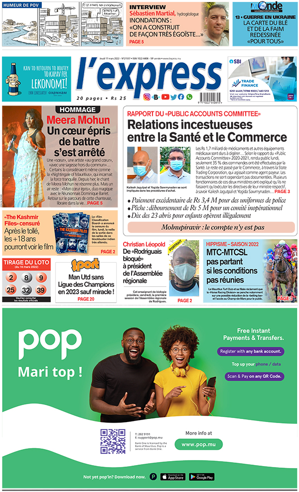 En une de l'express: PAC: relations incestueuses entre la Santé et le Commerce ; Autre titre: Meera Mohun: un coeur épris de battre s’est arrêté