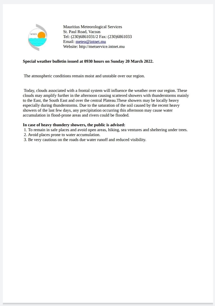 Les services météorologiques de Vacoas ont émis un bulletin ce dimanche 20 mars matin. Ils préviennent que des averses orageuses risquent de s’abattre, principalement sur les régions Est, Sud-Est et sur le plateau central. Avec un risque de crues. Ci-dessous le communique :