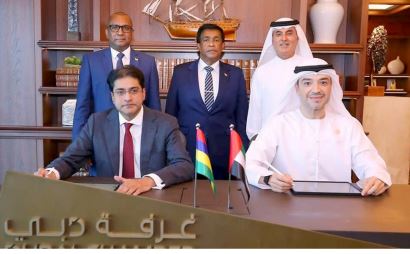 Le président Pradeep Roopun, Renganaden Padayachy à sa gauche et le CEO de l’EDB, Ken Poonoosamy (à l’avant-gauche) avec des officiers de la «Dubai Chamber of Commerce».