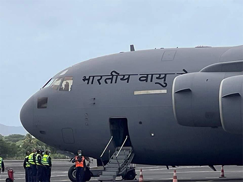 Atterrissage d'un C-17 de l'Indian Air Force à l'aéroport de Plaisance, peu avant midi, ce jeudi 31 mars.