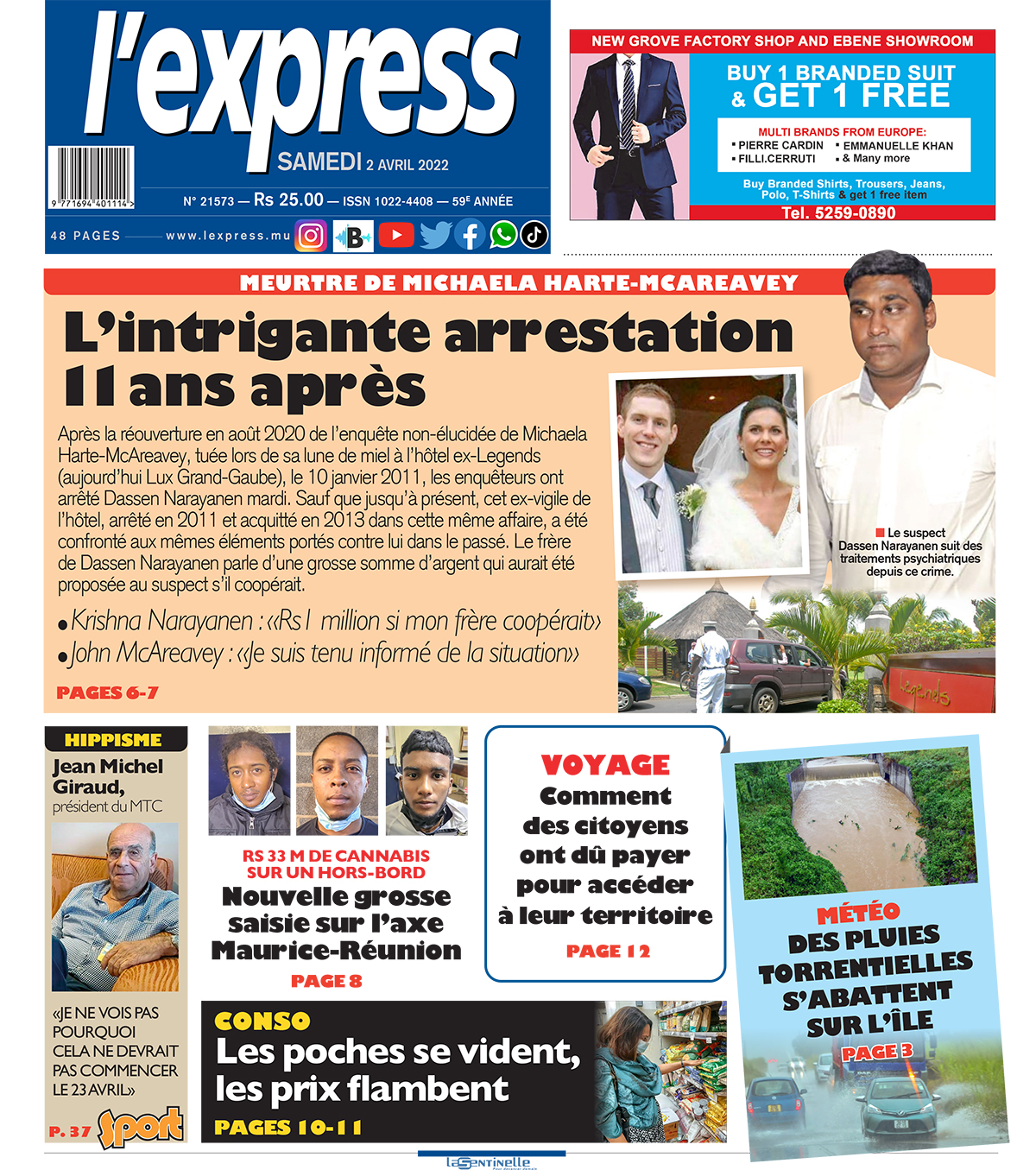En une de l'express: Meurtre de Michaela Harte-Mcareavey : L’intrigante arrestation 11 ans après ; Autre titre: Rs 33 M de cannabis sur un hors-bord : Nouvelle grosse saisie sur l’axe Maurice-Réunion.