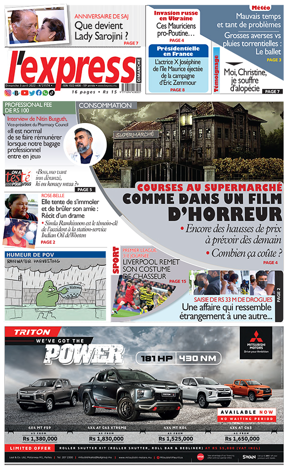 En une de l'express: Courses au supermarché: comme dans un film d’horreur ; Autre titre: Saisie de Rs 33 m de drogues: une affaire qui ressemble étrangement à une autre...