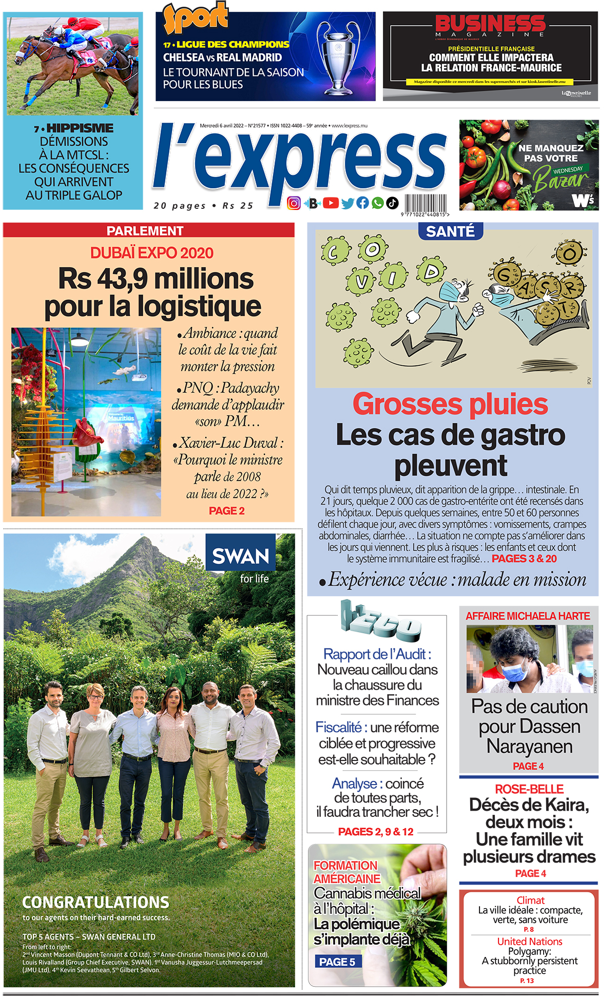 En une de l'express: Grosses pluies : Les cas de gastro pleuvent ; Autre titre: Affaire Michaela Harte : Pas de caution pour Dassen Narayanen.