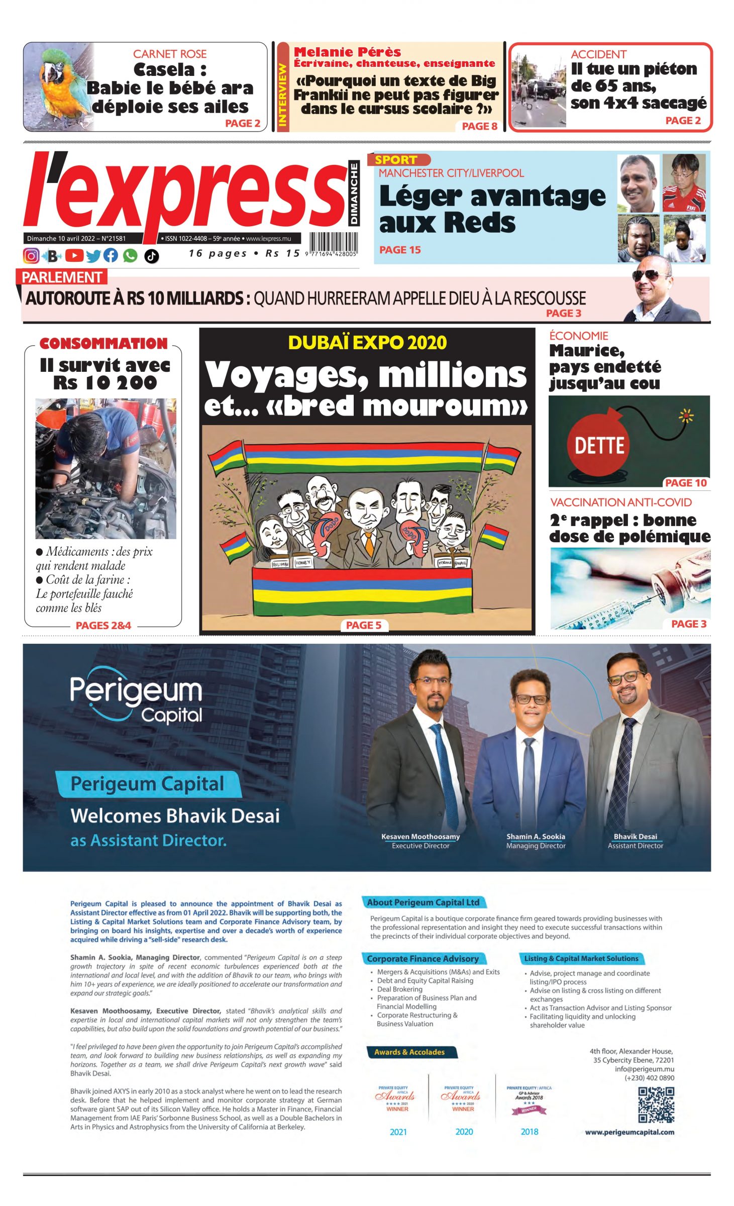 En une de l'express;Dubaï expo 2020:Voyages, millions et… «bred mouroum»;Autre titre; Il survit avec Rs 10 200.