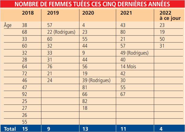 En mars, trois mères de famille âgées de 19 à 50 ans ont été tuées par leurs conjoints respectifs à quelques jours d’intervalle. Dixitha Veerapen a succombé sous les coups de son concubin à Bambous le 7 mars à la veille de la Journée internationale des femmes. Le 22 mars, le pays a été choqué d’apprendre le meurtre de deux autres femmes. Preety Futtingah a été étranglée par son époux, Juten, à Poste-de-Flacq sur fond de jalousie. Swaleha Khoyratty a également été étranglée dans son appartement à Plaine-Verte par son ex-époux, Feizal Mowhabuth, qui n’aurait pas digéré leur séparation et a ensuite consommé une dose de poison. Trois cas de féminicide en ce court laps de temps interpellent. Nous avons compilé les chiffres sur cinq ans.