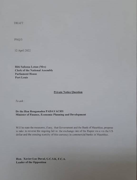 La formulation tient en une phrase mais c’est une question centrale à la crise économique actuelle. « Will he (NdlR : le ministre des Finances) state the measures, if any, that Government and the Bank of Mauritius, propose to take to reverse the ongoing fall in the exchange rate of the Rupee vis a vis the US dollar and the the ensuing scarcity of this currency in commercial banks in Mauritius ? »