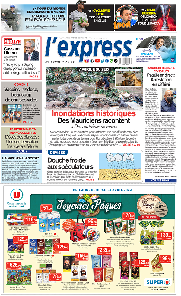 En une de l'express: Afrique du Sud │Inondations historiques: des Mauriciens racontent ; Autre titre: Devises: douche froide aux spéculateurs