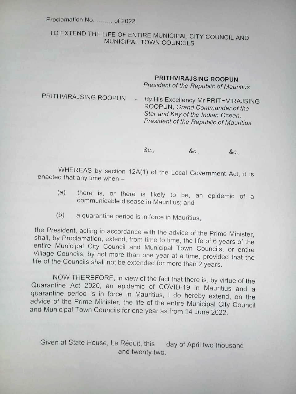 L'information qui circulait depuis hier soir est confirmée. Le président de la République, Pradeep Roopun, sur conseil du Premier ministre Pravind Jugnauth, a signé le décret pour étendre les mandats des conseillers municipaux jusqu’au 14 juin 2023. La décision a été gazetted, ce jeudi 14 avril. Pour rappel, Pravind Jugnauth avait fait amender la loi pour reporter ces élections une première fois, évoquant la pandémie de Covid-19. Les élections devaient avoir lieu au plus tard le 14 juin 2022.