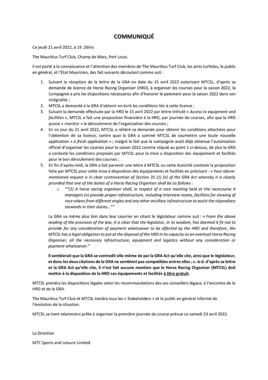À deux jours de l'ouverture programmée de la saison hippique, la MTCSL n'est toujours pas en possession de sa licence de «racing organiser» alors que la Horse Racing Division a déjà fait publier le programme de la 1ère journée. Dans un communiqué signé la direction de la MTCSL, subsidiaire du MTC, la chronologie des évènements depuis le 15 avril à ce jour est relatée.