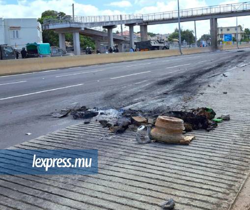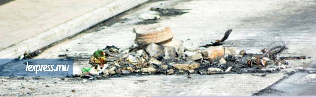 À Roche-Bois, vers midi, quelques dizaines de personnes étaient aux abords de l’autoroute. Plus loin, au rond-point de Baie-du-Tombeau, des véhicules de la SMF étaient stationnés, parés à toute éventualité. Sur le sol, des débris, des cendres. Dans l’air, une odeur de brûlé.