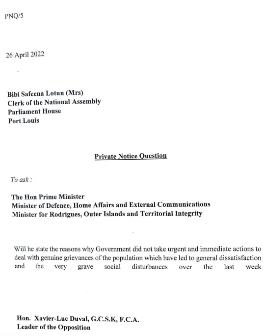 Ce mardi 26 avril, la Private Notice Question de Xavier Duval sera axée sur l’inaction du gouvernement. Il questionnera le Premier ministre sur les raison pour lesquelles le Gouvernement n’a pas pris d’actions immédiates pour adresser les doléances de la population.