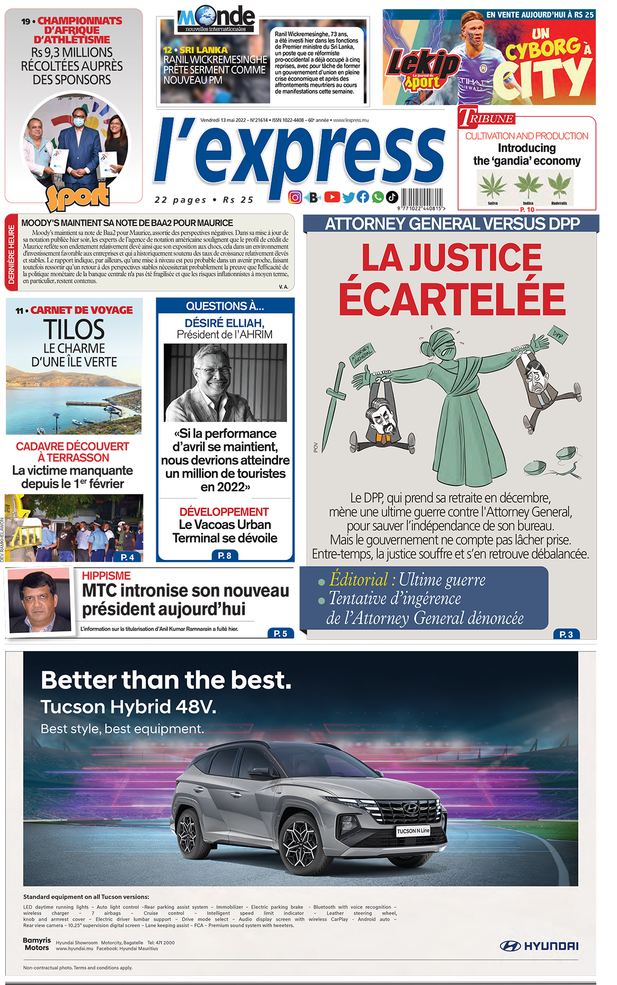 En une de l'express: Attorney General versus DPP : La justice écartelée; Autre titre: Cadavre découvert à Terrasson : La victime manquante depuis le 1er février.