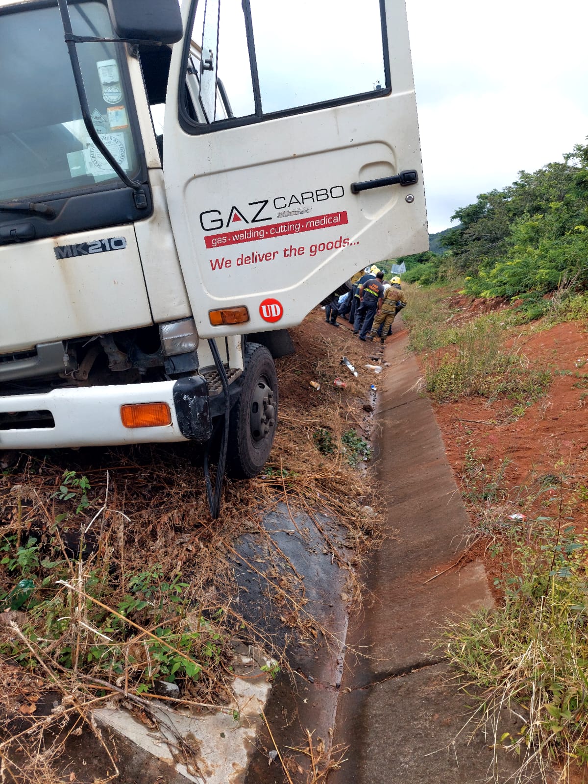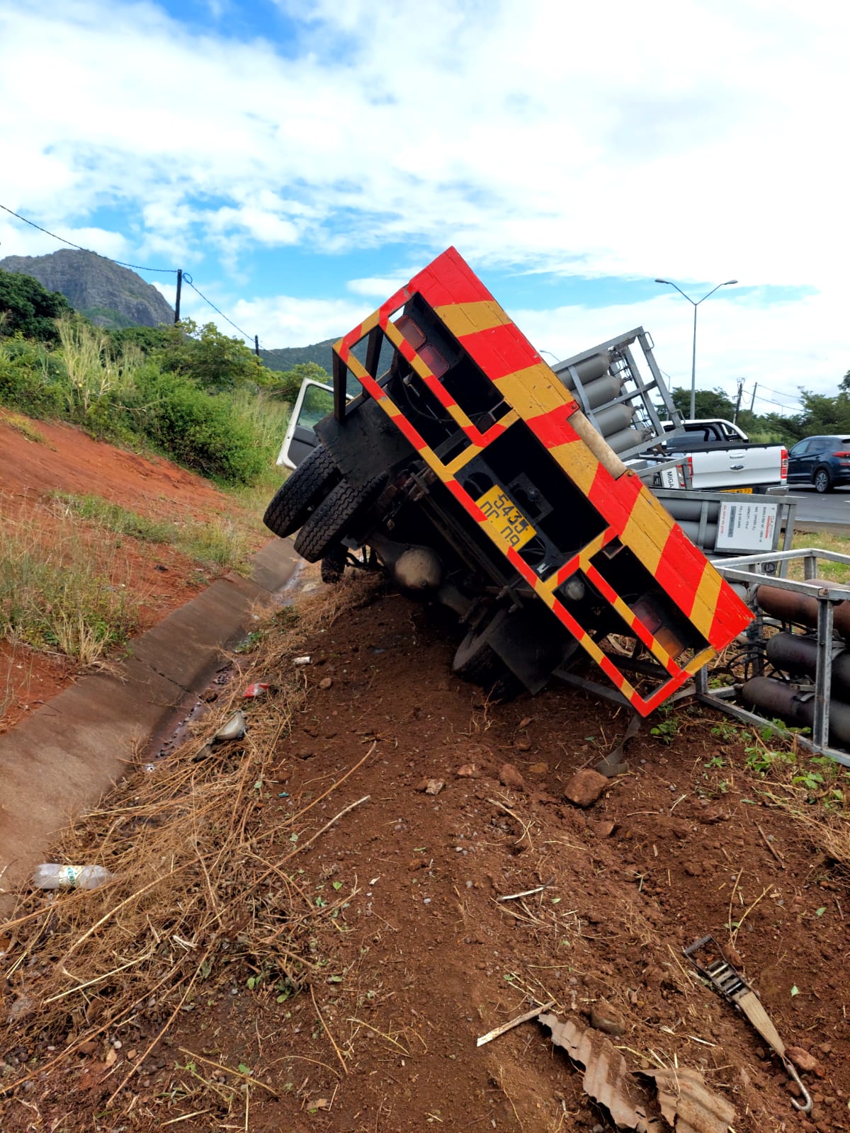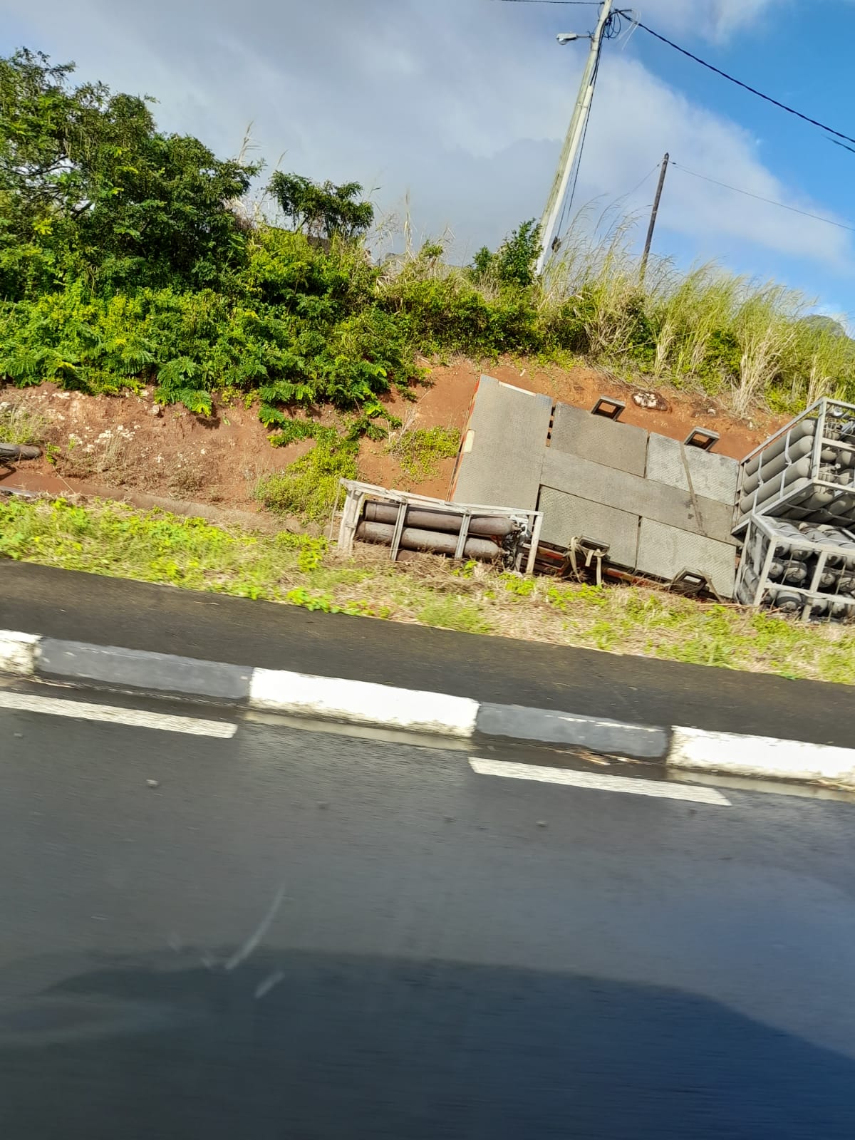 Un camion transportant des bouteilles d'oxygène s'est renversé ce jeudi 19 mai au rond-point de Valton en direction de Terre-Rouge.
