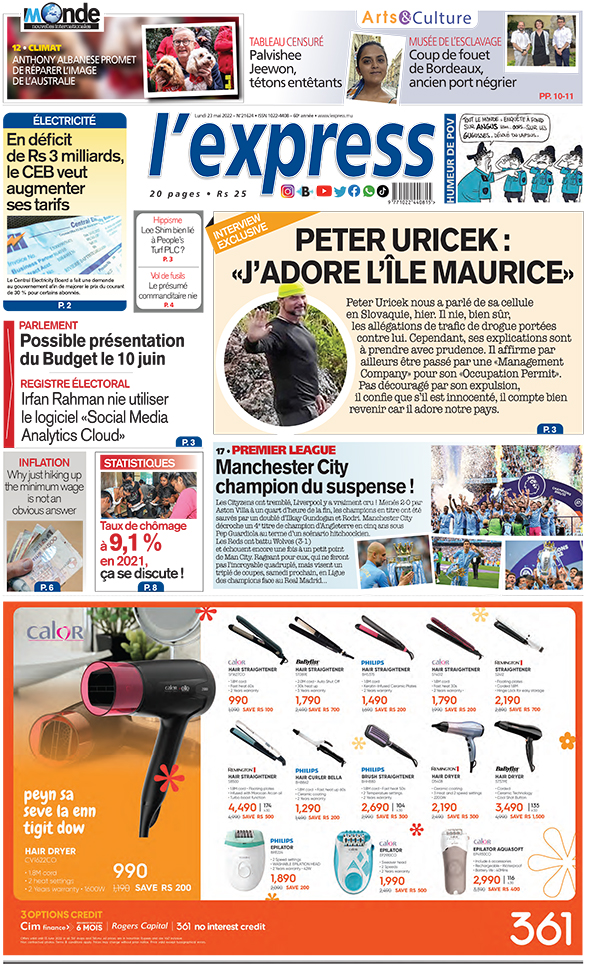 En une de l'express: Peter Uricek: «J’adore l’île Maurice» ; Autre titre: Premier League: Manchester City champion du suspense !